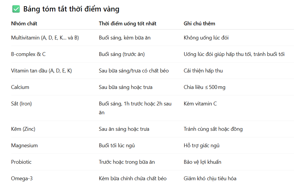 Việc bổ sung vitamin và khoáng chất đúng thời điểm sẽ giúp cơ thể hấp thụ tối ưu, giảm tác dụng phụ và gia tăng hiệu quả sử dụng